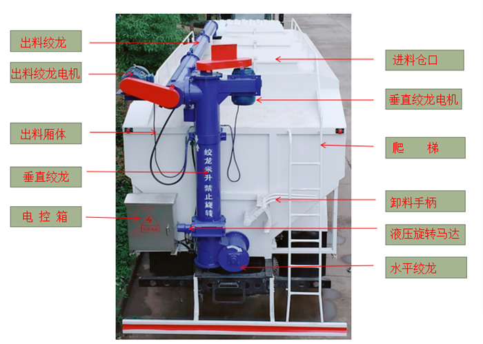 上裝罐體:罐體材質采用4mm優(yōu)質碳鋼板,整車3條絞龍,由3個5.5KW電機380V外接電源帶動頂部絞龍用液壓控制舉升,可左右旋轉180°。罐體內分為貳個倉,可以獨立控制各分倉卸料順序和速度。